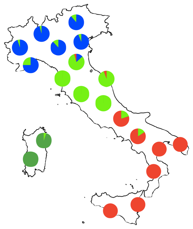 The purple component was predominant in Southern European groups and equally distributed along the peninsula (average frequency of 46%), almost reaching fixation in Sardinians (85%) plausibly due to their long-term isolation especially to Post-Neolithic processes. [...] The green component was considerably represented in samples from Caucasus and Middle East, being also evident in some Southern European populations (e.g. Greeks) and, especially, in Southern Italy (28%), progressively decreasing towards the northern part of the peninsula (12%). [...] The red component characterized most of Central and Eastern European populations, being reduced in Sardinia (7.4%) and showing a decreasing north-south gradient in peninsular Italy (from 39% in N_ITA to 20% in S_ITA).